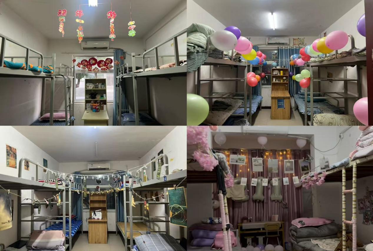 宿舍美化评比中,同学们巧思绽放,匠心独运,让平凡的宿舍空间焕发出独特的光彩与温度。有的宿舍运用缤纷气球与彩带打造出轻盈活泼的节日氛围;有的通过手工装饰制作墙饰、挂件,展现别致的手工温度;更有同学结合自身专业特色,打造出主题鲜明的宿舍风格——电影爱好者们用海报、胶片元素与灯光布置,营造出影院级的沉浸氛围;汽修专业的学子则以工具模型、机油桶创意改造、机械零件装饰,将工业美学融入生活空间,彰显专业认同与创意活力。