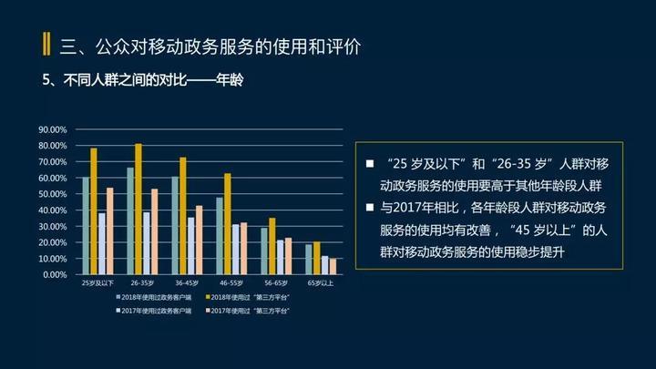 报告显示,“45岁以上”的人群也有着不低的移动政务服务使用率。