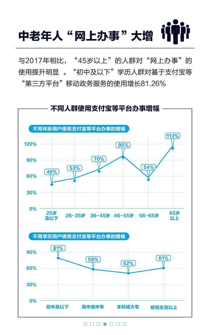 值得关注的是,“互联网+政务服务”的发展显现出了很好的普惠性。报告显示,与2017年相比,“初中及以下”学历人群在支付宝等“第三方平台”的使用比例增长81.26%。