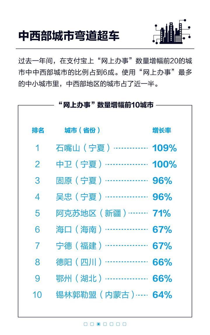 在这股科技便民的风潮中,东部沿海城市得风气之先,但中西部城市也不甘落后。统计显示,过去一年,在支付宝上搭载政务服务数量增幅排名前20的城市有9个来自西部省份,3个来自中部省份。而从老百姓的使用情况来看,排名前30的中小城市中, 中西部地区城市占到近一半。