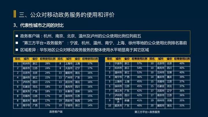 在移动政务服务的公众使用率排名中,浙江多个城市上榜,位列第一。