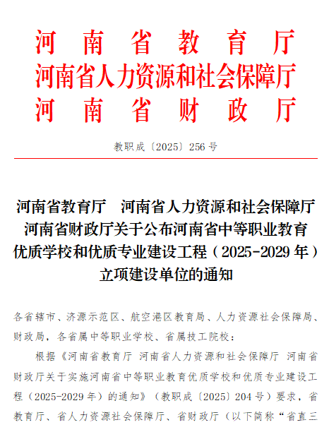 近日,河南省教育厅、河南省人力资源和社会保障厅、河南省财政厅联合下发《关于公布河南省中等职业教育优质学校和优质专业建设工程(2025—2029年)立项建设单位的通知》(教职成〔2025〕256号),学院凭借良好办学条件、突出育人成效,成功入选河南省中等职业教育优质学校立项建设单位。