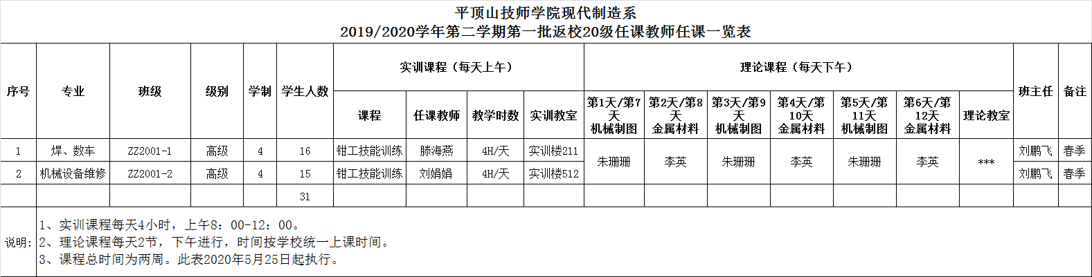 平顶山技师学院 现代制造系“停课不停学”网络授课课程表