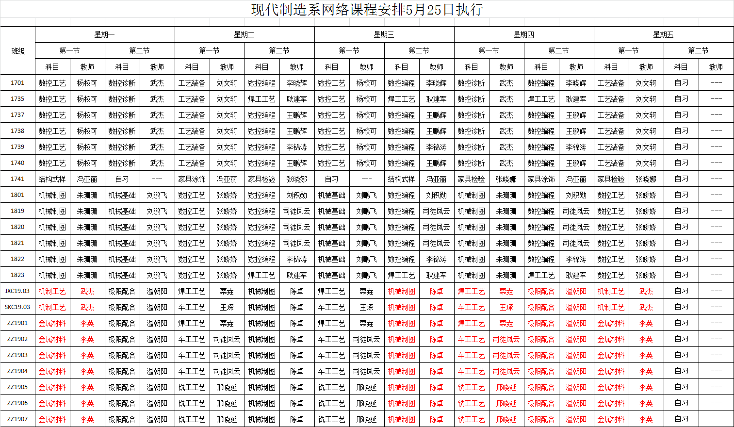平顶山技师学院 现代制造系“停课不停学”网络授课课程表